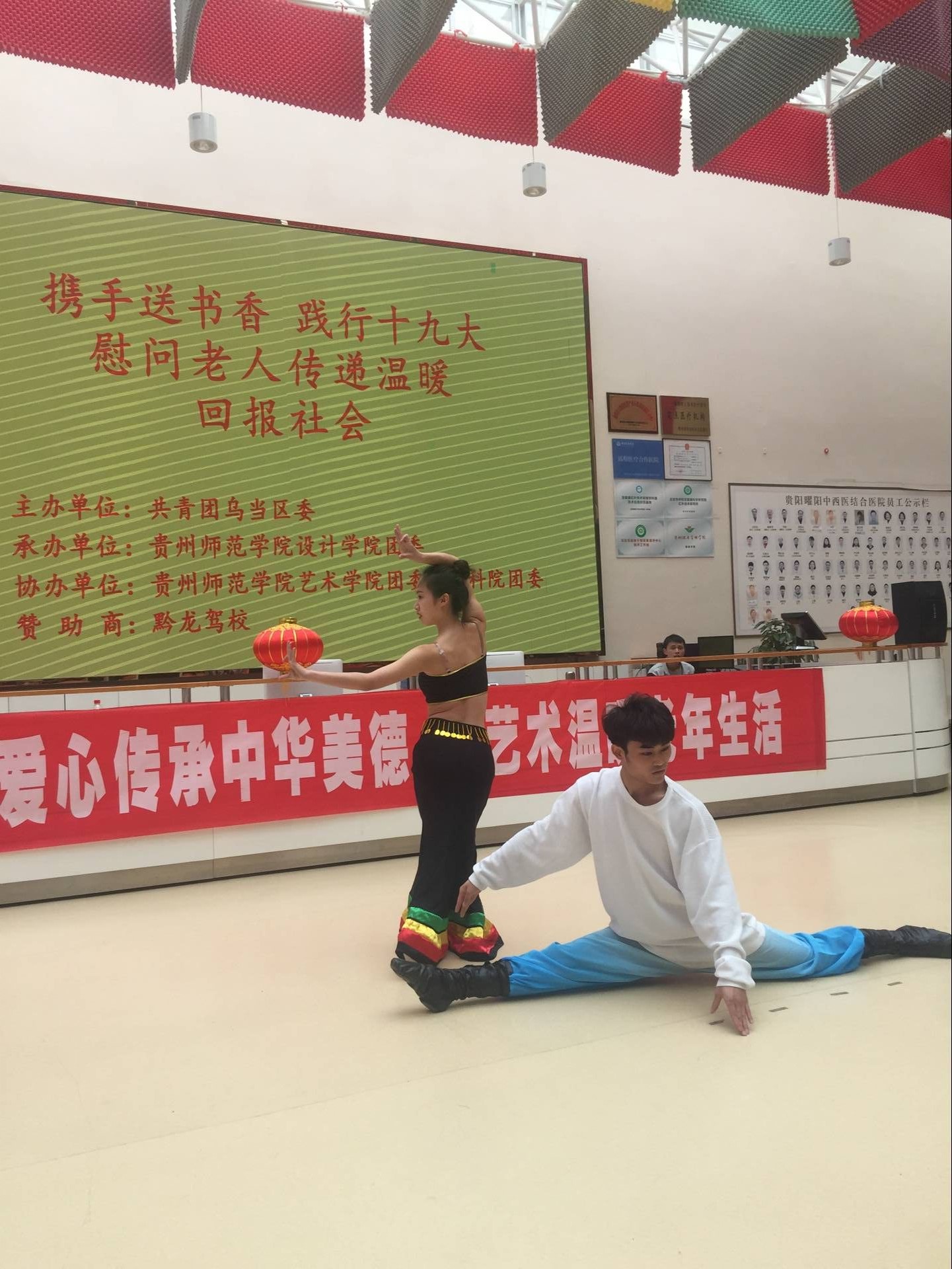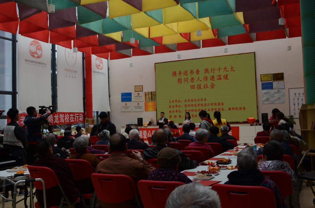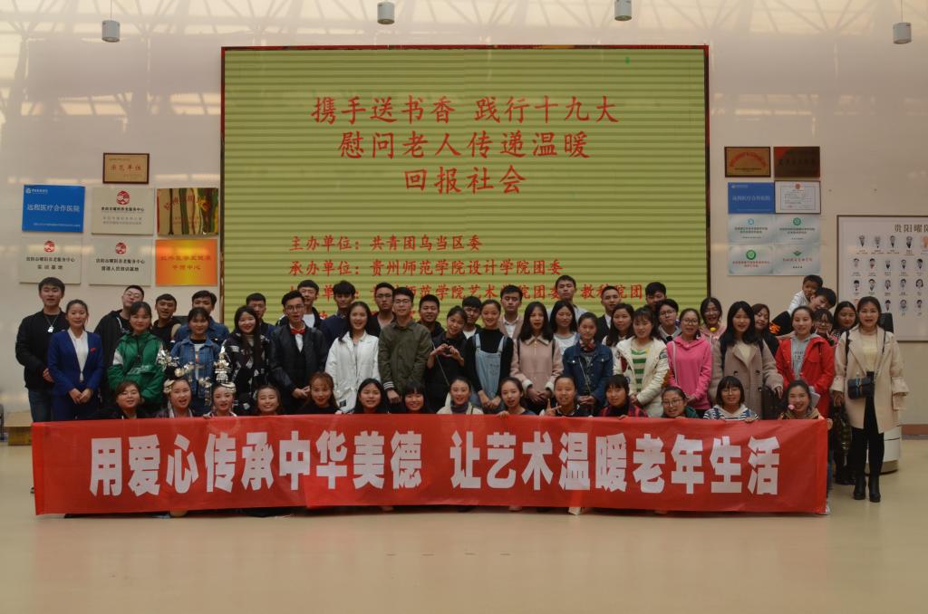 雷锋活动月,携手送书香,践行十九大,慰问老人传递温暖。3月25日13:30,共青团乌当区委书记郑玉霞、副书记周玮及工作人员;设计学院副院长聂森、团委书记黄美诤及师生代表;艺术学院、教育科学学院学生一行共65人前往贵阳曜阳养老服务中心开展“用爱心传承中华美德,让艺术温暖老年生活”的慰问活动。