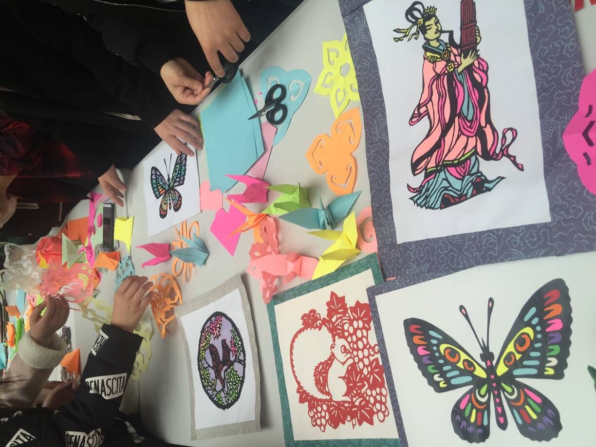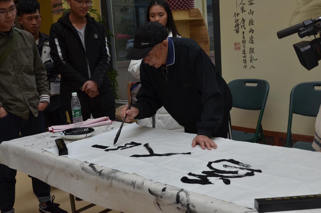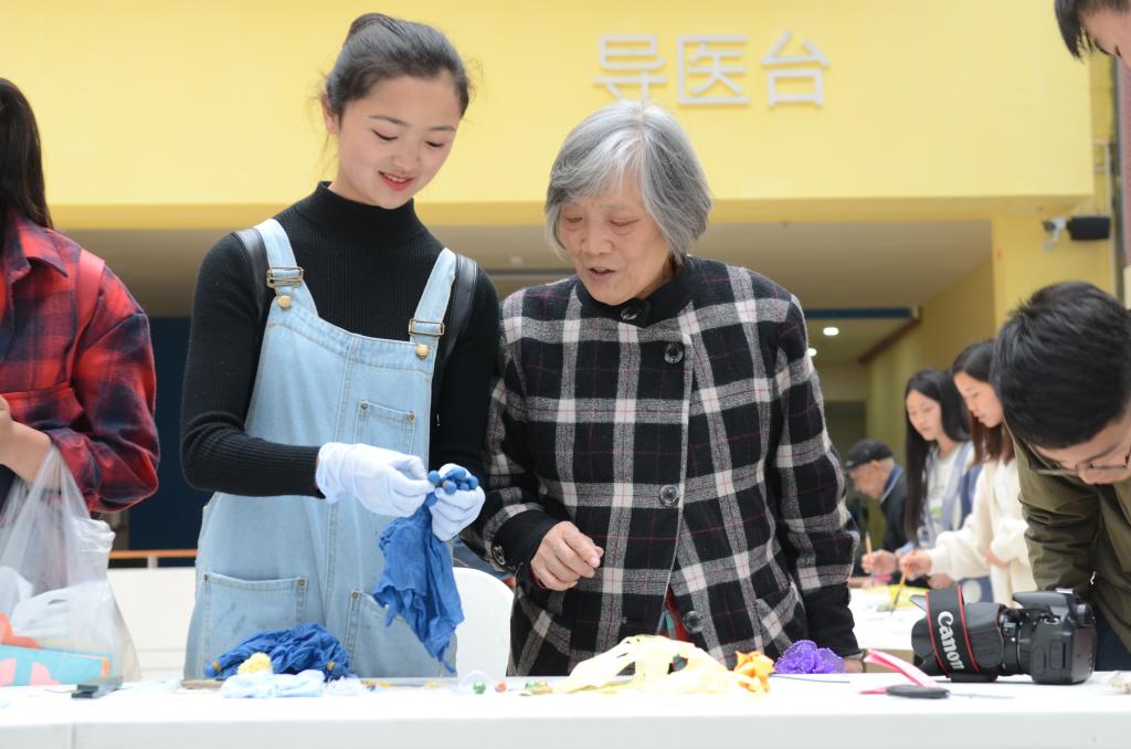 接下来,老人们根据喜好,进行分区域的艺术体验活动,有的老人来到扎染区,和同学们一起制作自己喜欢的围巾;有的来到书法、国画区和同学们一起探讨中国文化的博大精深;有的来到剪纸、手工艺品制作去,老人们收到礼物,高兴的合不拢嘴。有的老人则利用这个时间段给同学们分享丰富的工作经验和传奇人生经历,给同学们上了一堂意味深长的人生课。