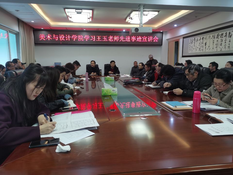 为学习宣传王玉老师教育扶贫、教书育人的先进事迹,积极引导广大教师争做党和人民满意的“四有、三者”好老师,进一步营造尊师重教的良好氛围,美术与设计学院于3月3日在学院微信工作群中发出号召,开展学习王玉老师先进事迹活动,同时要求广大教师结合《新时代高校教师职业行为十项准则》及《贵州师范学院教师师德失范行为处理办法》进行研讨。3月8日组织全体教职工集中学习了王玉老师的先进事迹。