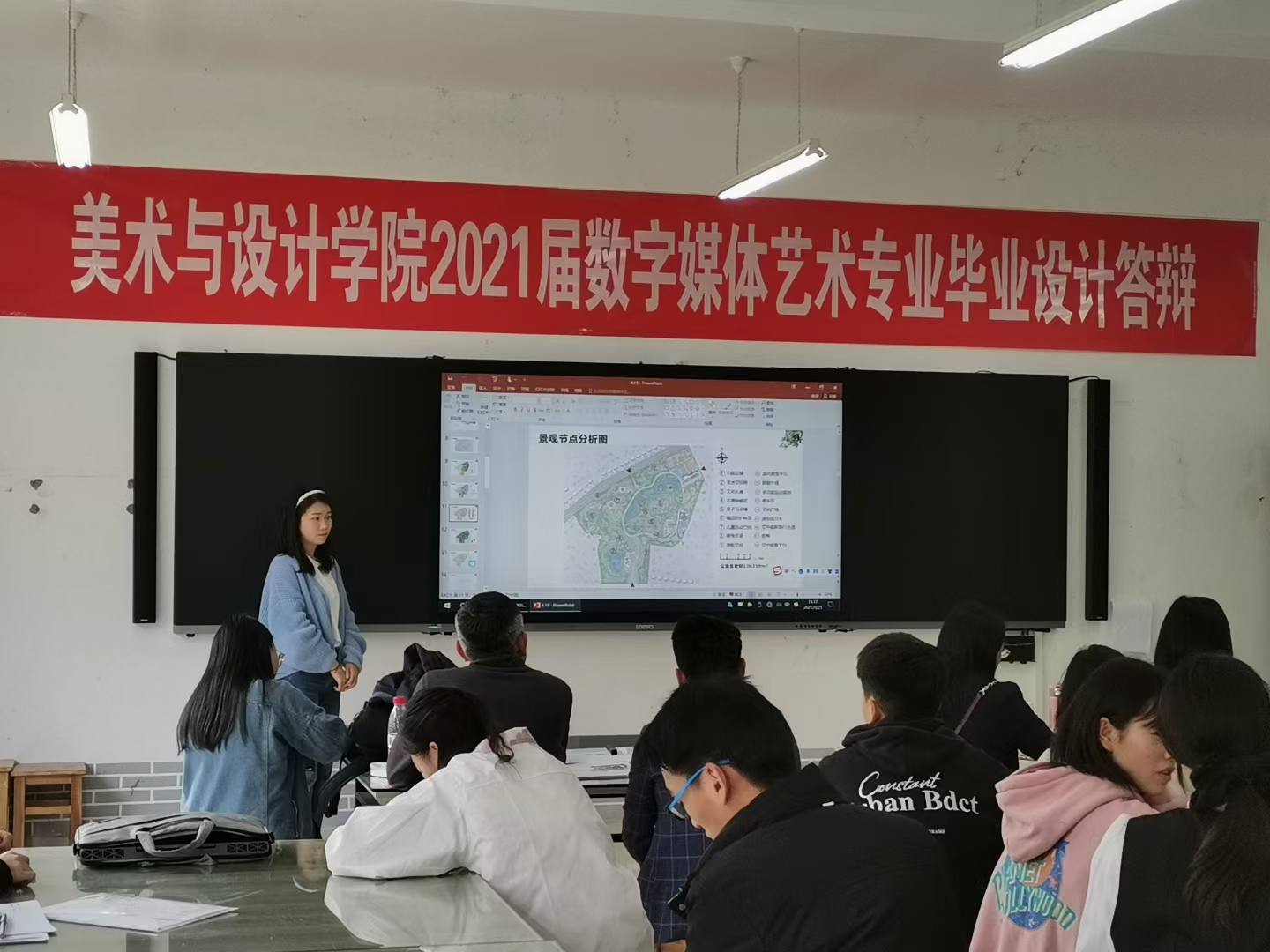 对于2021届美术与设计学院的各专业的毕业生而言,毕业创作(设计)是展现他们四年学习成果的最好的方式。4月21日-24日,美术与设计学院美术学、数字媒体艺术、产品设计专业2017级毕业生分别在明义楼、逸夫楼教室分为6个答辩场地举行了毕业创作(设计)的答辩活动。本次答辩按美术学专业分为国画组、油画组、综合组、设计组四个答辩组;数字媒体艺术专业分为影视广告、数字景观两个答辩组;产品设计专业分为现创、文创两个答辩组分别进行答辩。为保证答辩的质量,学院还邀请了中国建筑标准设计研究院贵州分院院长毕友刚;松溪美术馆馆长黄向阳;贵州效果动画科技有限有限公司负责人韦天斌;贵州华源文化传播有限公司设计总监、贵州省美术家协会设计艺术委员会副秘书长赵智勇老师;多彩贵州文产集团项目经理黄倩等行业老师参与了答辩活动。
