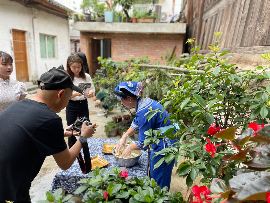 “呀阿豆乌”是主推当地特色非遗食品豆腐圆子的一家农家乐,门店设计装修和特色文化产品等方面还有较大的提升空间。团队分为摄影和设计两组,进行了有针对性的材料采集。首先,摄影团队负责人樊亚老师带着五名同学拍摄了传承人手工制作豆腐圆子的整个过程。樊亚老师强调同学们要发挥主观能动性,积极创新,把所学的专业知识充分应用到当下的实践环节中来,提高自身的实践应用综合能力。