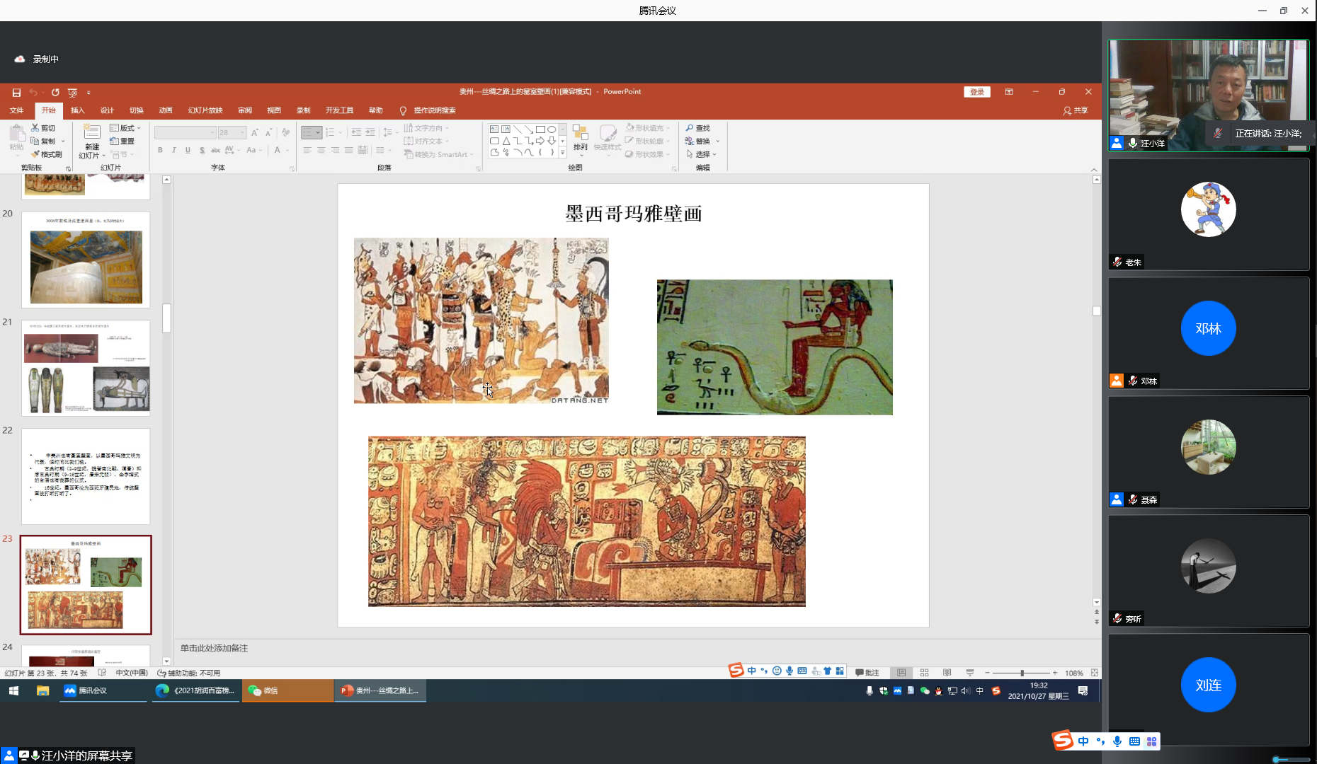 10月27日晚,东南大学汪小洋教授为美术与设计学院师生作了题为《中国丝绸之路上墓室壁画视觉图像研究》的主题讲座,讲座以腾讯会议的方式进行,由美术与设计学院院长聂森教授主持,聆听讲座的除了美设学院的师生外,还有旅游文化学院、历史与档案学院以及部分省内外高校的师生参与。