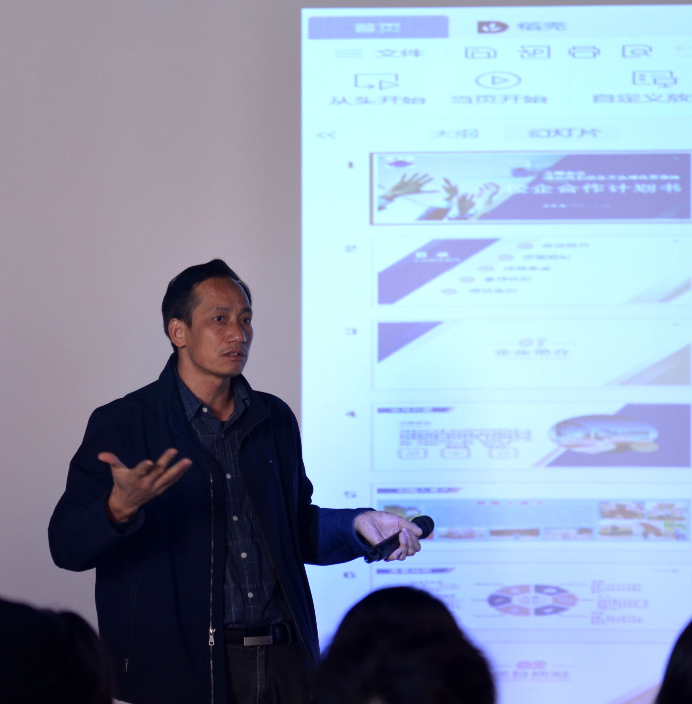 首先,朱昌来介绍到场的各位嘉宾与领导并表示热烈欢迎;接着,石含洲致欢迎词,同时指出设计来源于生活,同学们应做到“学以致用、知行合一”;随后,刘董事长对公司的业务范围、项目规划、合作计划和成功案例等基本情况和近年来取得的成就做出了介绍,他希望同学们将设计走入生活,融入生活,希望感兴趣的同学能够参与到该公司项目的产品设计中,也欢迎同学们到该公司实习、就业。