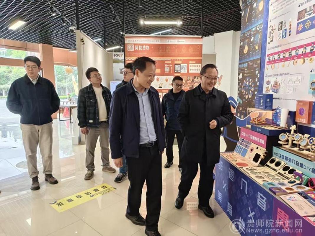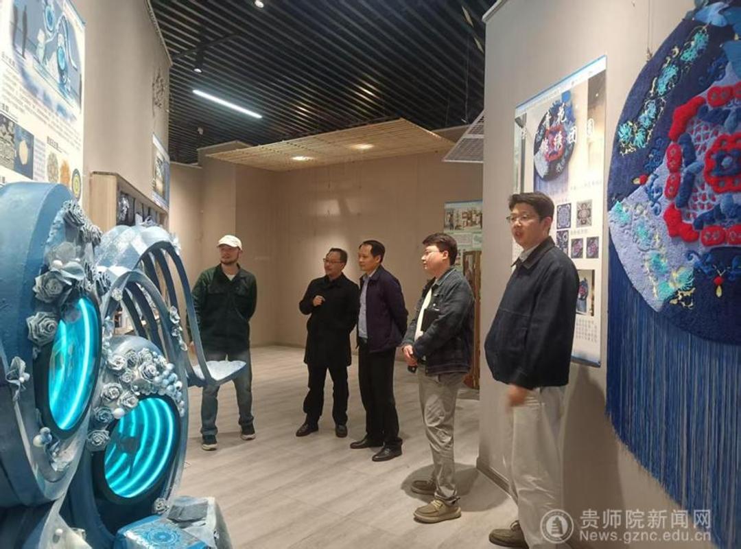 活动伊始,聂森院长介绍了学院办学特色及“十年十县” 服务地方的实践成果,重点提及学院2026届以“大美贵州· 活力乌当”为主题的毕业设计作品展,学院师生紧扣乌当非遗、民族特色与城乡发展需求,创作一系列贴合地方发展的设计作品。随后,封洪福书记谈到观溪路街道正处于城市更新提质的关键阶段,需要注入丰富的文化内涵。他希望以此次合作为纽带,将学院的艺术设计力量融入街道背街小巷改造、社区环境美化等工作。最后,聂森带领封洪福一行实地参观了“大美贵州,活力乌当”2026 届毕业设计作品展。