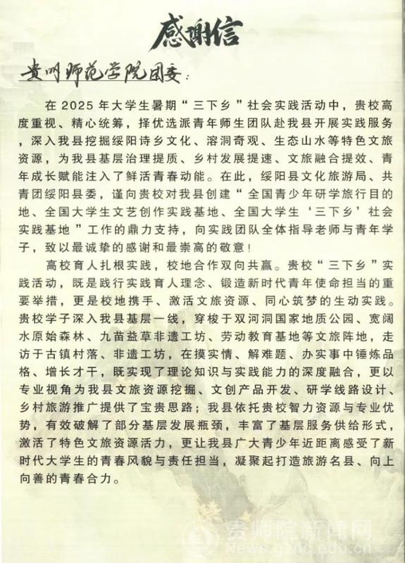 近日,一封来自绥阳县委团委的感谢信送达贵州师范学院团委,信中高度点赞我院暑期“三下乡”实践团队,为绥阳县乡村振兴发展注入了蓬勃青春力量。