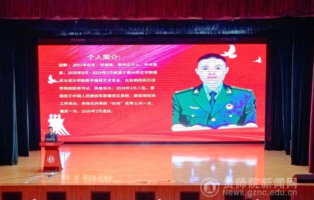 在热烈的掌声中,退役大学生士兵田野走上讲台,以亲身经历讲述了自己从校园到军营的蜕变历程。他分享了在部队中的日常训练、思想磨砺与成长收获,用真实而质朴的语言展现了军营生活如何锤炼意志、塑造品格,如何在坚守与奉献中深刻理解责任与担当。他还结合自身专业背景,谈到军旅生涯如何激发了他的创作灵感——那些训练场上的汗水、战友间的深情、任务完成后的自豪,都成为他退役后艺术表达的重要素材。他详细介绍了部队的优良作风、大学生征兵优惠政策以及退役后的复学与发展通道,鼓励学弟学妹们把军营当作另一个“大画布”,用青春和热血绘就属于自己的壮丽篇章。现场互动氛围热烈,不少同学表示深受触动,对携笔从戎、艺术报国有了更真切的体悟。